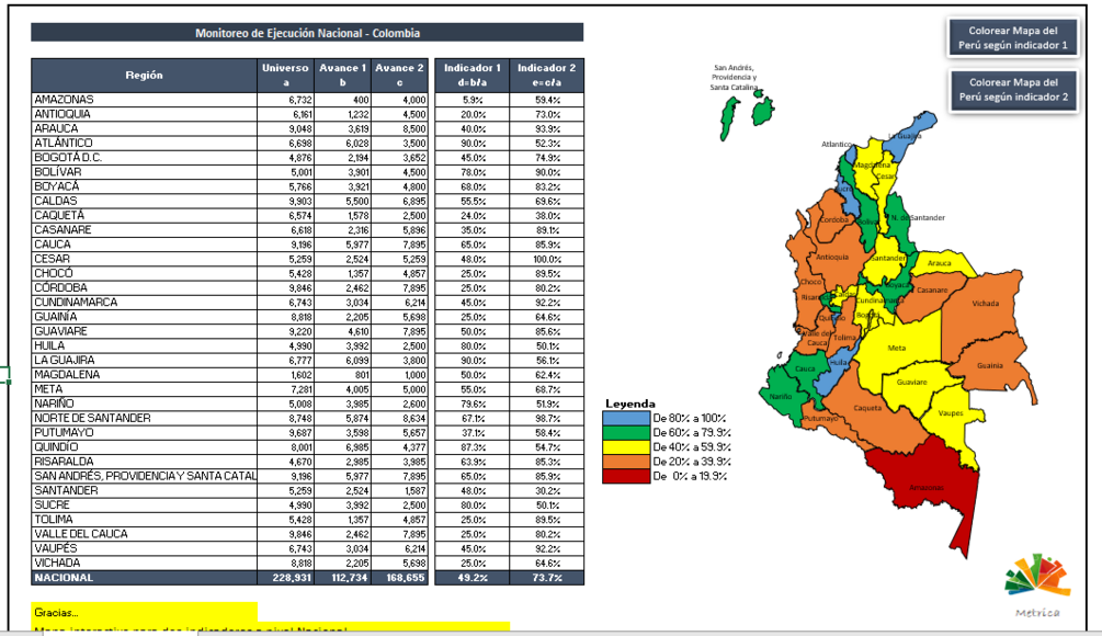 Se trata de un archivo Excel con macros que pinta mapas departamentales de Colombia. El usuario puede seleccionar el indicador que desea visualizar en el mapa.